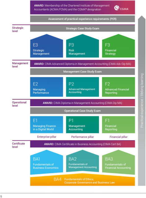 CIMA实施进阶型考试、阶段性授证,有基础级、运营级、管理级和战略级四个级别的考试。学生每通过一个级别的考试,即可被授予相应级别的证书,依次包括CIMA商业会计证书(CIMA Cert BA)、CIMA管理会计文凭(CIMA Dip MA)、CIMA管理会计高级文凭(CIMA Adv Dip MA)等。学生通过最高级战略级的考试,并具备相关工作经验后可申请获得CIMA皇家特许管理会计师公会会员资格及CGMA全球特许管理会计师头衔。