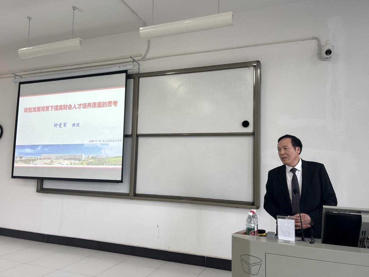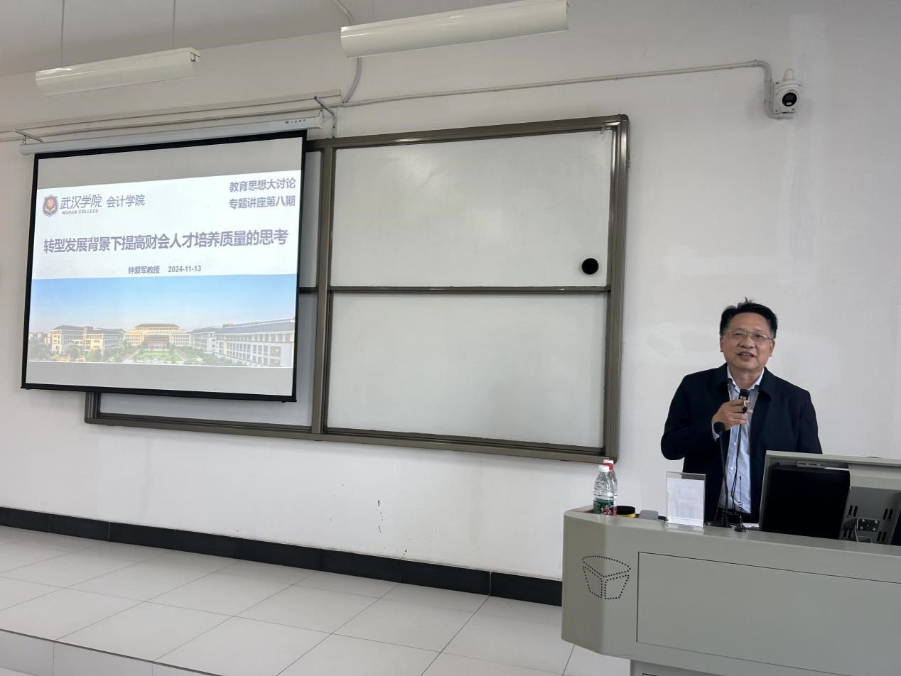 11月13日下午,yl6776永利集团邀请武汉商学院钟爱军教授在学3207作教育思想大讨论专题讲座——转型发展背景下提高财会人才培养质量的思考。本次讲座由院长谢进城教授主持,副院长邹晶、院长助理周磊及全体教职工共同聆听。