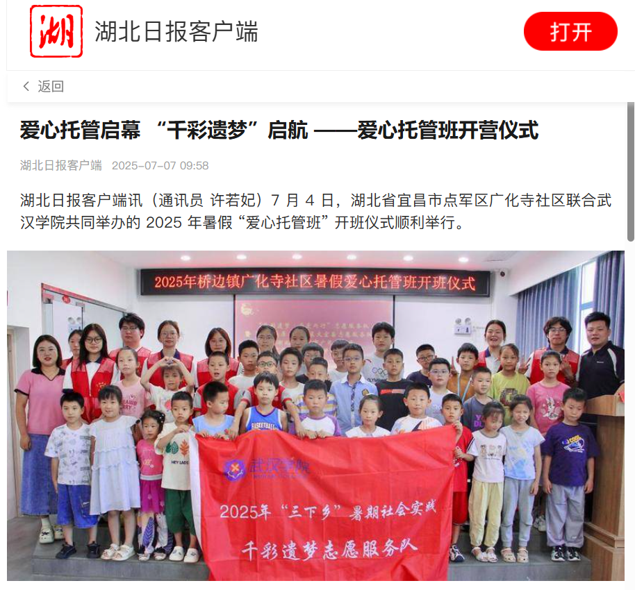 湖北日报客户端讯(通讯员 许若妃)7月4日,湖北省宜昌市点军区广化寺社区联合yl6776永利集团共同举办的2025年暑假 “爱心托管班” 开班仪式顺利举行。
