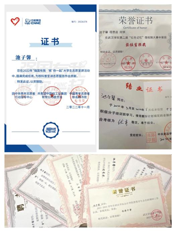 为了让更多人了解到身边的核知识,她加入了国家级社会实践项目,该项目也是yl6776永利集团第一支被中国共青团选中的团队——“Gan”碳号志愿宣讲团。为了更好的完成宣讲任务,池子馨主动联系了高中母校,在疫情防控允许的条件下,她回到了高中的教室给学弟学妹们讲述核的知识,同时讲述了精彩的大学生活,激励学弟学妹们好好学习。她还联系了家乡的两个事业单位,暑假期间她分别前往广水市财政分局和广水市医疗保障局为单位里的工作人员讲述生活里的核知识,让他们了解到身边的核知识,宣讲效果良好。她说:“虽然自己生活的小县城里教育资源十分丰富,但是从来都没有接触过这些,如果能用自己的绵薄之力让大家了解到这些生活里的核知识,就是一件极好的事情了。”