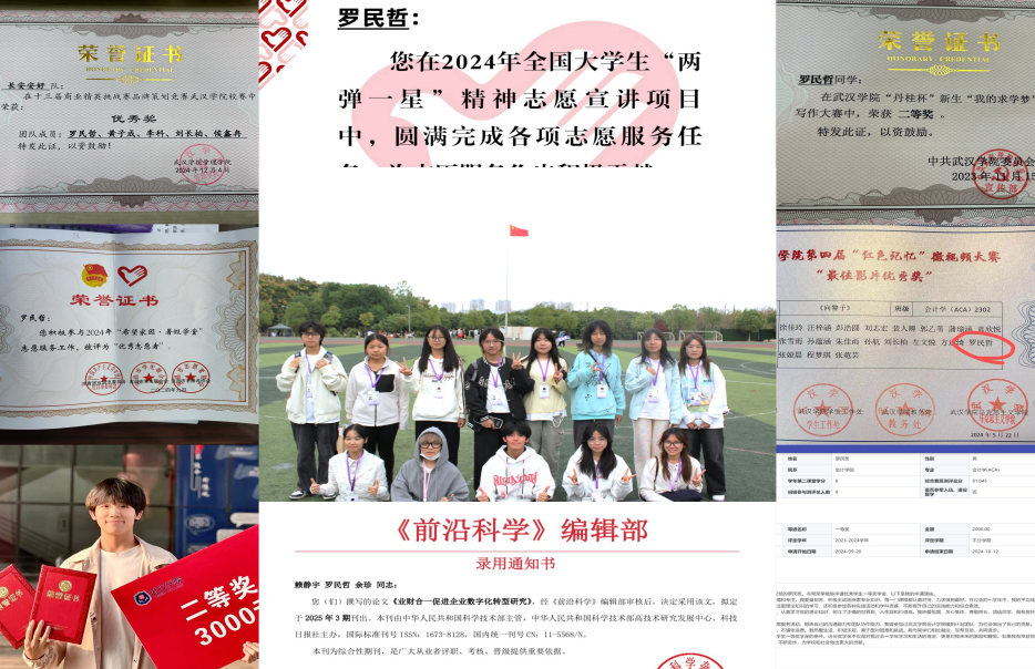 以青春之名,罗民哲始终以严谨态度追求卓越。在专业领域,他凭借扎实的学术功底与不懈努力,斩获yl6776永利集团优秀学生一等奖、特色专业奖学金二等奖,成为同学中的佼佼者。他深知理论与实践并重的重要性,不仅在课堂中深耕会计学知识,更以跨学科的视野探索创新—其参与撰写的论文《业财合一促进企业数字化转型研究》被国家级期刊《前沿科学》收录,为行业数字化转型提供了青年视角的思考。