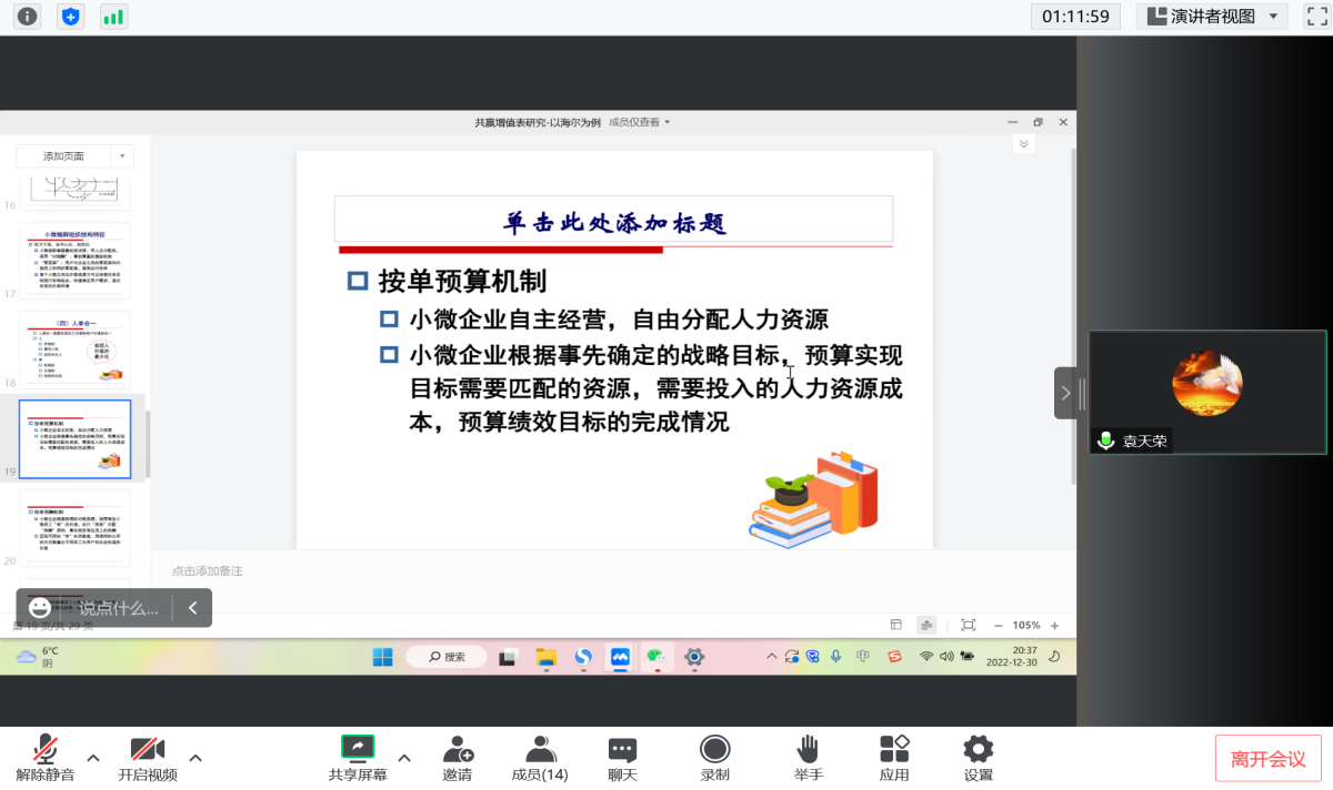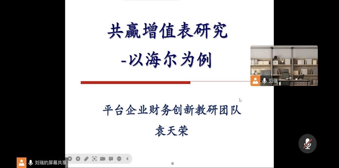 会上,袁天荣以海尔为例介绍共赢增值表,介绍了平台企业创新的背景、内容、优势与应用条件。平台企业是当前市场的重要组成部分,平台企业财务创新研究是财务管理教研的内在需求。团队要持续提升针对平台企业财务创新的能力,与企业、相关专业开展交流合作,推进教研成果的创造性转化。