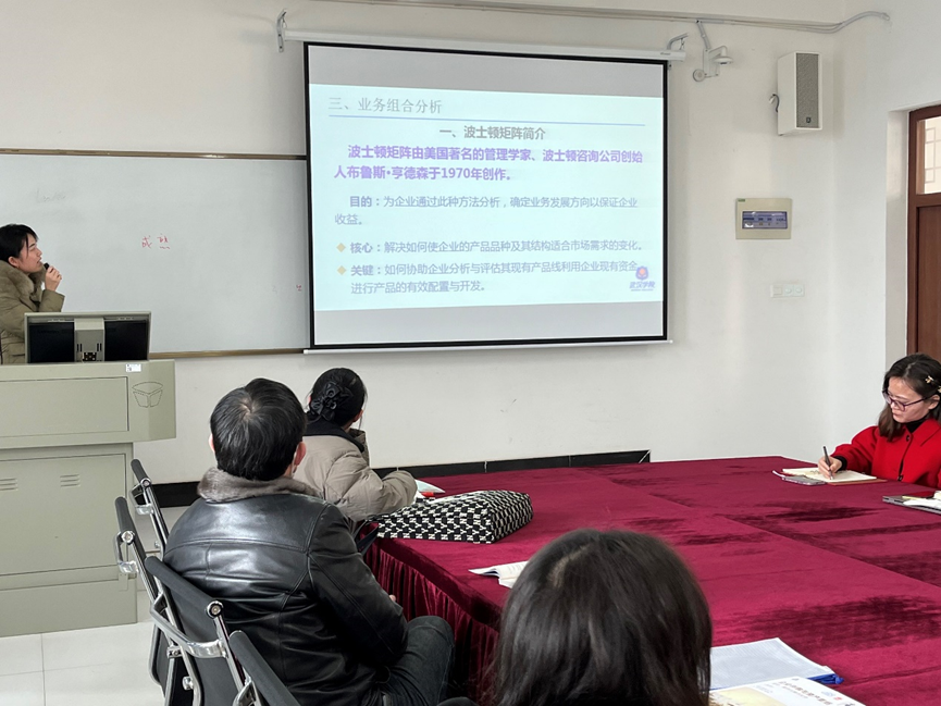 翟丽芳老师本次磨课内容是企业内部环境分析。翟老师授课后,在座的老师们纷纷提出了改进建议。其中,胡小波老师提出在第四周可以安排学生参与演练,可以提升课堂质量,增强师生课堂互动效果;李俊英老师指出相关案例可以更新,引入最新案例。