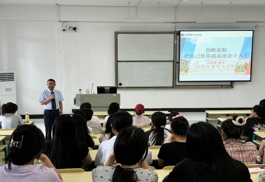 随后,孙贤林以“扬帆起航——把自己培养成高级会计人才”为主题开讲。他围绕“爱上专业,多学工具”“选好目标,志存高远”“制定规划,全面发展”“坚持不懈,大展宏图”四个维度,用生动案例引导同学们挖掘会计专业魅力,掌握数据分析等实用工具;鼓励大家锚定高级会计人才等高远目标,明晰职业方向;强调制定涵盖学业、实践、素养提升的成长规划,实现全面发展;更叮嘱同学们在成长路上坚守初心、持之以恒,方能在会计领域大展宏图。