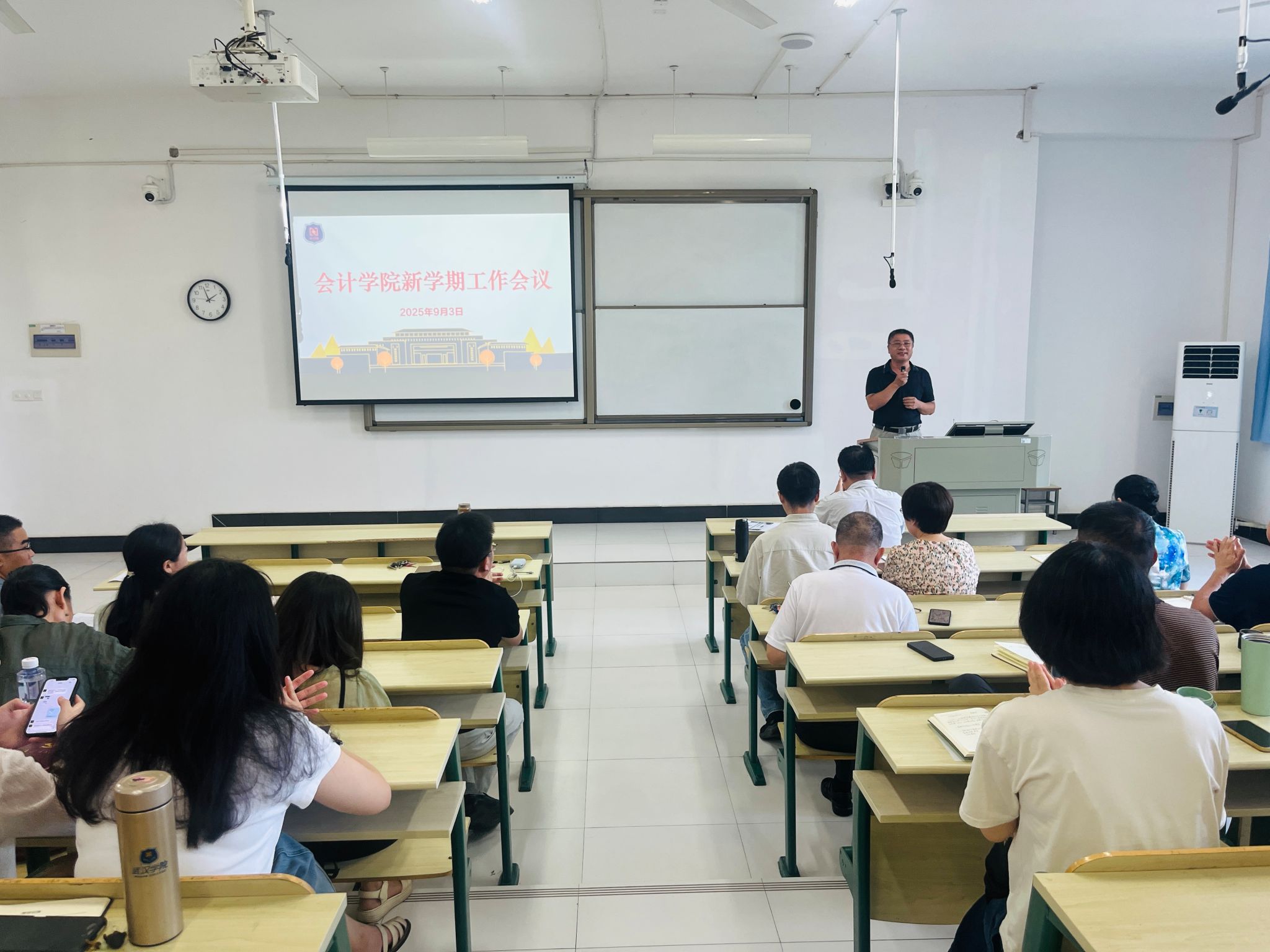 院长助理周磊通报了学院暑期科研工作完成情况,并对新学期科研申报工作作出具体安排,鼓励全体教师结合学科方向与研究兴趣积极参与各类各级科研项目申报,提升学院整体科研水平。他同时介绍,学院已顺利完成“十五五”规划编制工作,接下来将重点推进规划落地实施——从教师个人发展规划、各系部工作规划到各专业建设规划,逐层分解目标、细化举措,为学院学科建设与长远发展奠定坚实基础,同时为后续审核评估与审计硕士点建设积累有力支撑。