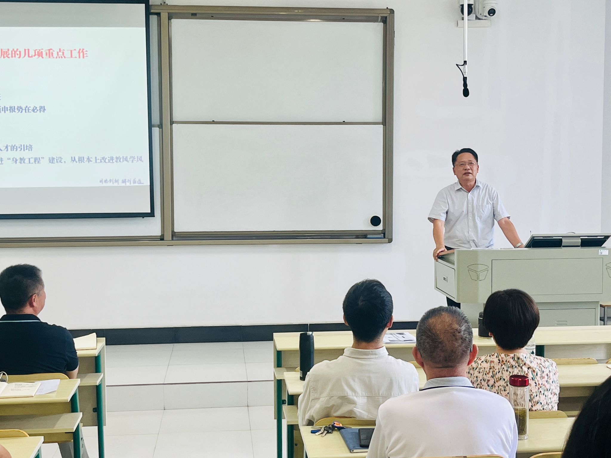 院长谢进城作总结讲话,为学院新学期发展擘画蓝图。他首先回顾了暑期各项工作的落实情况,传达了学校中层领导干部会议相关精神,肯定了全院教职工在暑期工作中的辛勤付出,重点解读和强调了近期国务院下发的《关于深入实施“人工智能+”行动的意见》与中央教育工作领导小组印发的《高等教育学科专业设置调整优化行动方案(2025—2027年)》两个重要文件,要求全体教师高度重视、深入学习领会文件精神,结合学院实际与自身工作,思考如何将文件要求转化为具体工作思路与举措,切实将政策红利转化为学院发展动力。