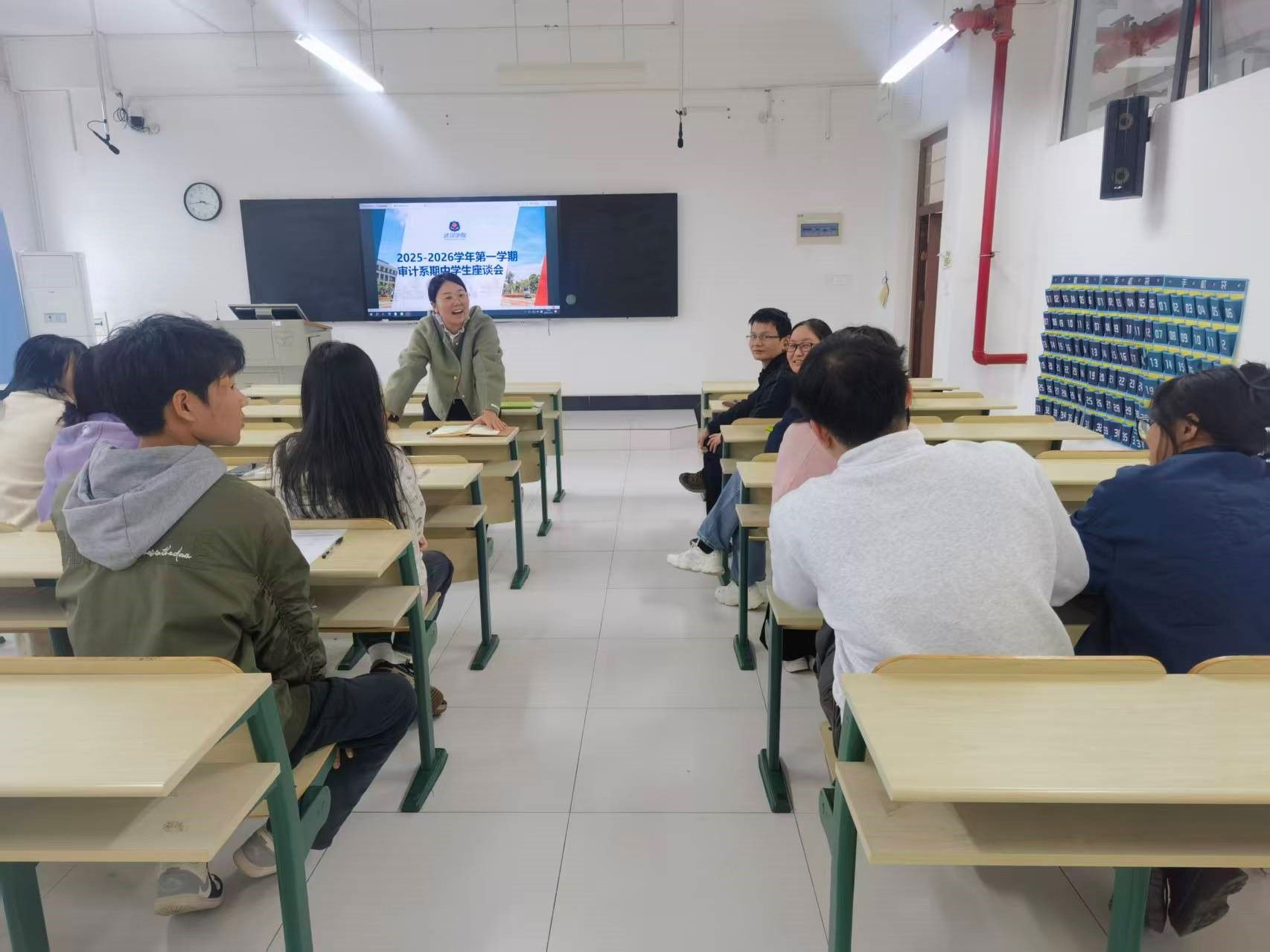 审计系在学3103教室举办了学生座谈会,审计系主任李杉杉、副主任叶飞燕及部分专业课教师参与交流。座谈会上,学生代表就课程设置、实践教学、未来职业规划等方面提出宝贵意见。有学生指出部分课程章节内容存在重复,希望优化课程大纲;也有同学提出专业课学习困难等问题。李杉杉耐心解答,从人才培养方案设置、课程衔接与递进关系等角度阐述课程逻辑,并表示将充分听取学生建议,优化课程设置。叶飞燕补充强调学风建设的重要性,鼓励学生主动求索,为自己赢得机会。