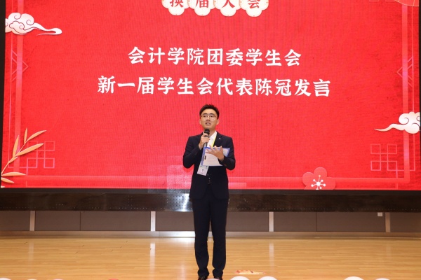 新一届团委学生会代表陈冠发言。他表示能够担任这一职务是一份荣誉,更是一份责任。提出要在前辈的基础上进行创新,推进新型趣味活动来丰富同学们的生活。坚持“人心齐,泰山移”理念,加强内部管理,完善规章制度,增强集体意识、责任意识,为学院的各项工作创造更多的价值。