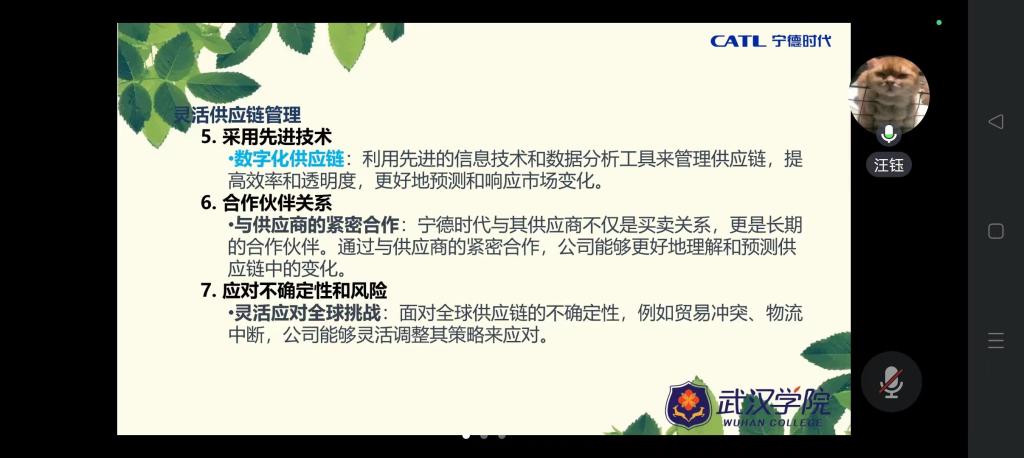汪钰分享了宁德时代供应链案例探究,分别从宁德时代的供应链布局及数字化供应链、宁德时代与供应商共同技术研发关键点、宁德时代预测性库存控制的特点等方面进行了陈述。袁天荣指出案例内容讲解很细致,并提出供应链管理对公司产生的影响效果要结合数据来分析,力求找到公司的亮点,并深入挖掘。