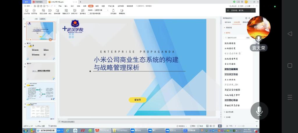 翟丽芳分享了小米公司商业生态系统的构建与战略管理探析的案例,分别从案例公司基本情况、小米商业生态系统的构建、战略管理分析等方面进行了陈述,并与其他老师对小米产品性能以及其创始人雷军的个人事迹展开了激烈讨论。袁天荣点评翟老师的小米案例做的很用心,指出小米商业生态系统、竹林系统非常好,并建议战略管理研究可以结合公司发展历程来进行分类整理,增加企业绩效等方面内容,也可以结合雷军捐款等事迹进行思政点的设计。