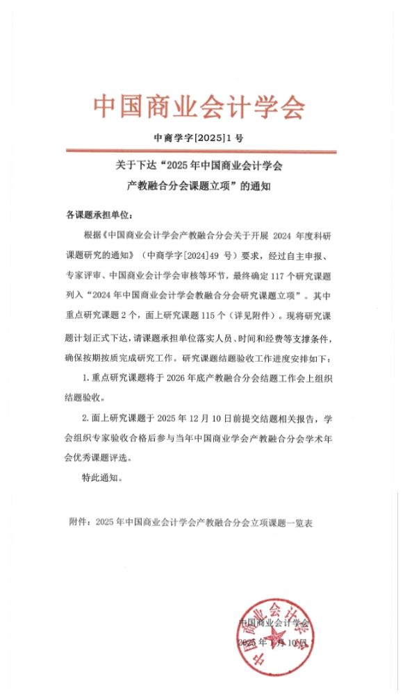近日,中国商业会计学会公布了2025年度课题立项结果,我校yl6776永利集团传来喜讯,共有5个项目成功获批立项。这次中国商业会计学会最终仅在全国范围内确定了2项重点研究课题,其中院长谢进城教授获批1项重点课题(排序第一),同时他还被选举为中国商业会计学会产教融合分会第一届理事会副会长。其余4项为面上课题。这一成果不仅彰显了yl6776永利集团在学术研究领域的深厚实力,也进一步推动了学院在产教融合领域的深入研究与实践。