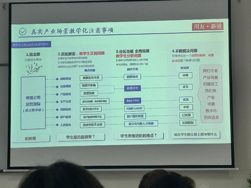 部分教师结合前期相关科研结果,就当前教学中存在的问题与新道团队展开热烈讨论。刘瑞指出,部分课程体系在企业实际应用中存在知识衔接不足、数字化工具融入不够等问题,希望通过此次大纲修订和人才培养方案优化,进一步强化数智技术与专业课程的融合,增加实践教学比重,提升学生的数字化技能和创新思维。新道团队针对教师们的建议逐一回应,表示将结合产业最新动态,为大纲编制和人才培养方案提供更多贴合实际需求的教学资源和技术支持,助力学院培养“懂技术、精业务、会管理”的复合型人才。