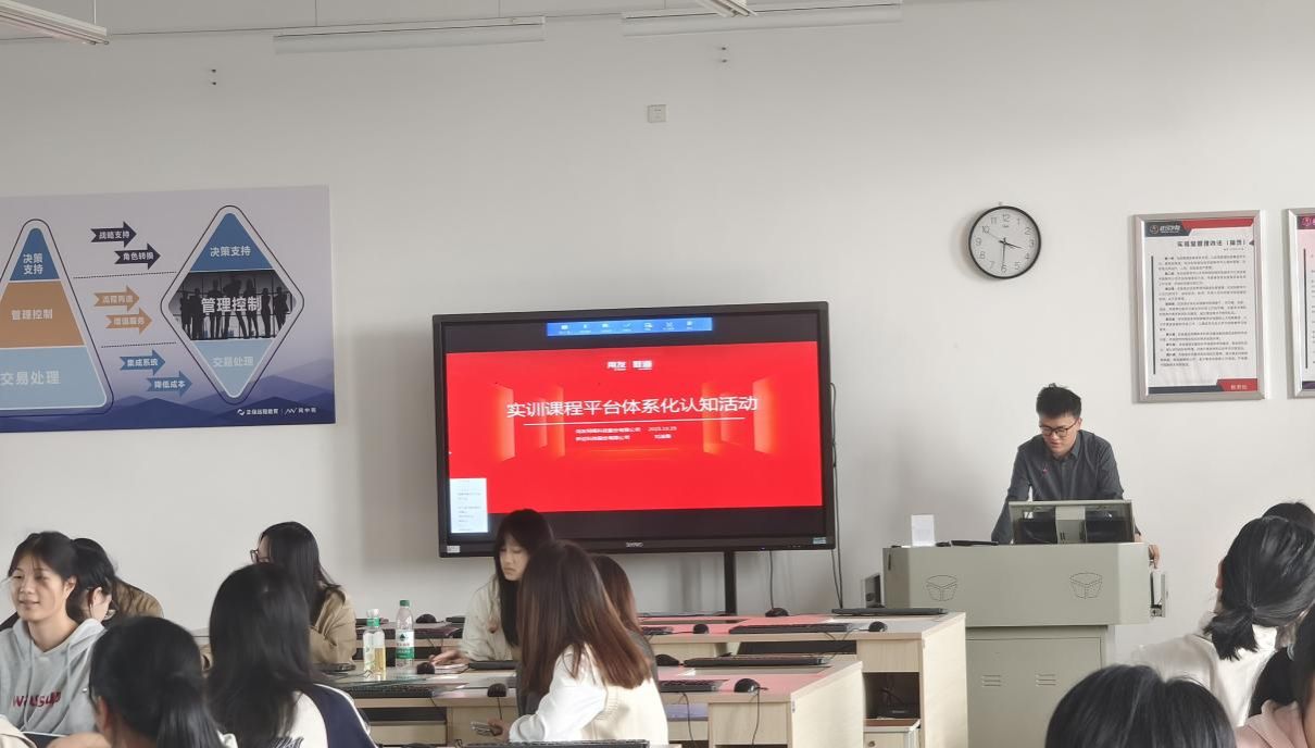 为深化数智化教学改革,推动课程体系与产业需求紧密对接,2024级财务管理(用友班)于10月29日成功举办十月特色活动。本次活动特邀新道科技股份有限公司湖北分公司技术实施工程师刘溢霈担任主讲,以“把数智商业融入校园”为核心理念,为学生带来了一场系统化、产业导向的认知实践课程。
