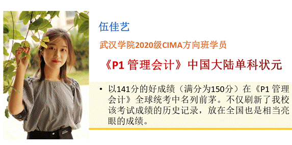 财务管理(CIMA) 2001班伍佳艺同学取得管理会计考试中国大陆区单科第一名