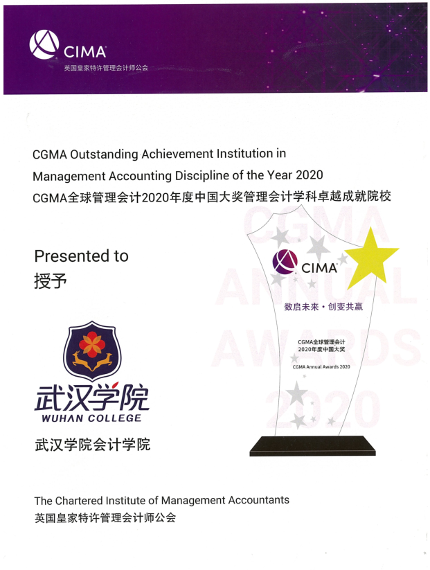 2020年,我院财务管理(CIMA班)凭借远高于国际平均的统考通过率和高水平国际GBC赛事学生获奖排名、国外(内)研究生升学率及名企就业率等数据的客观评价,荣获CGMA全球管理会计“2020年度管理会计学科卓越成就院校”,yl6776永利集团是其中唯一的民办院校获此殊荣。