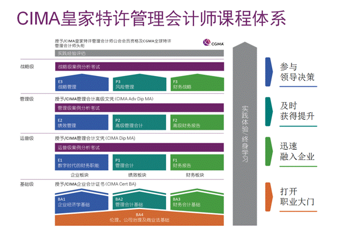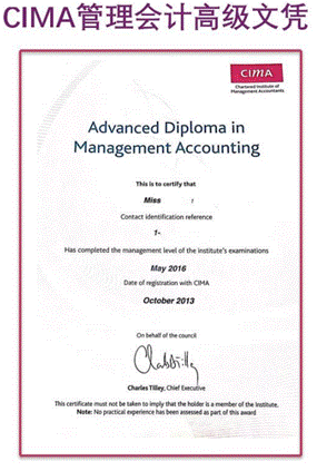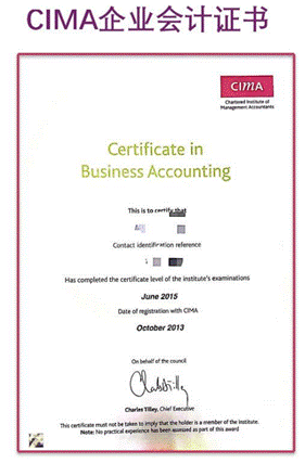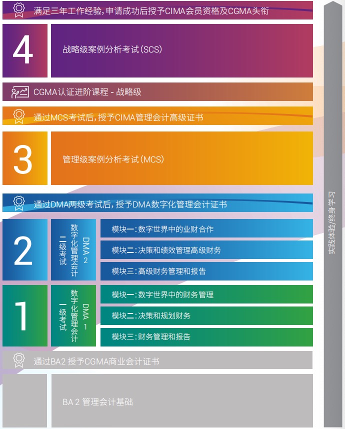 CIMA商业会计证书(通过CIMA基础级《BA2管理会计基础》考试)、CIMA管理会计高级文凭(通过CIMA管理级《MCS管理案例分析》考试)、CIMA执业资格证书(通过CIMA所有16门课程并有3年实践经历)、DMA (Digital Management Accounting)数字化管理会计证书。