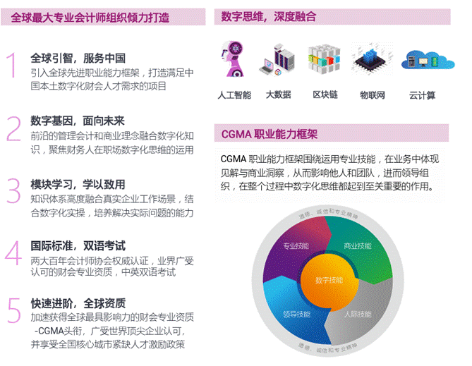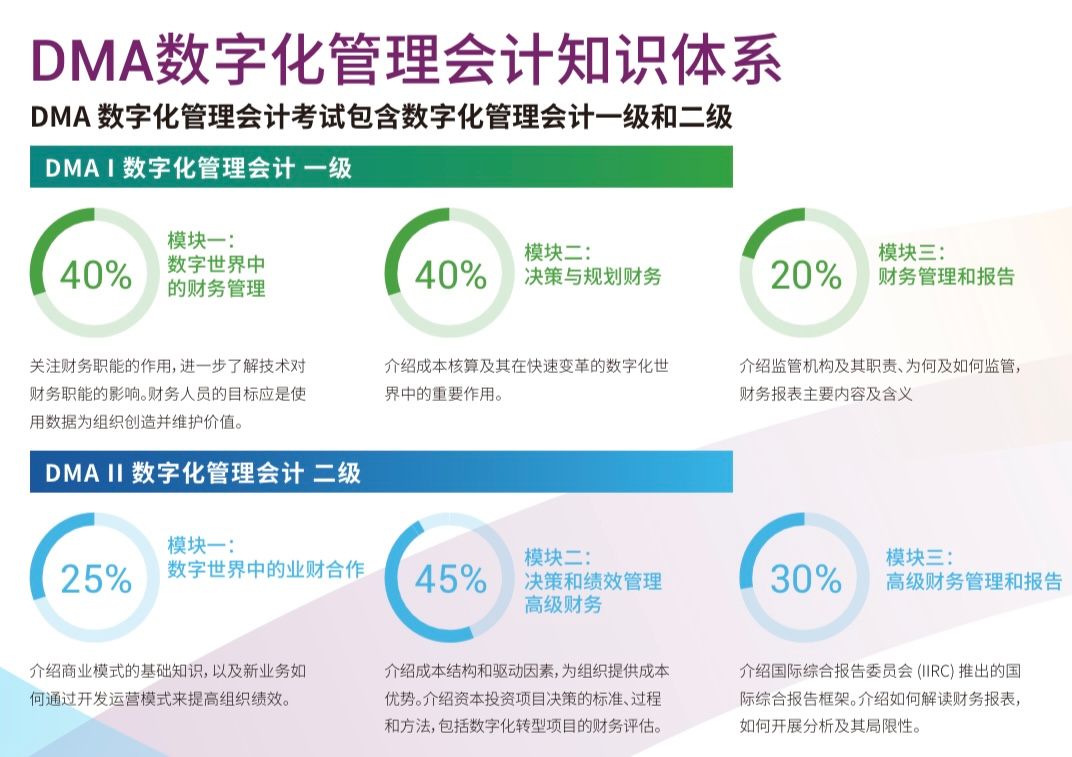 为顺应国家数字化经济转型战略,CIMA公会携手中国国际人才交流基金会引入数字化管理会计,将数字化作为全球特许管理会计师职业能力框架的核心技能,并以此为蓝图,设计开发了为中国财务人量身打造的DMA认证体系。结合一系列专业主题、数字化理念和实践模块,推动财会专业人员的技能转型和升级。