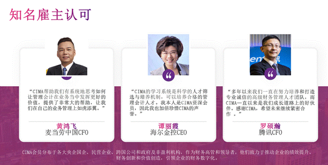 包括麦当劳、腾讯、中兴通讯、四大会计师事务所在内的全球超过4500家世界五百强、大型国企、跨国公司等各类知名企业高度认可CIMA课程与证书,为CIMA学员优先提供实习、就业与岗位晋升机会。除此之外,财务管理(CIMA班)学生还能额外获得名企提供的专属实习就业内推机会。