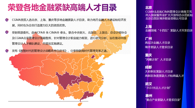 2014年以来,财政部已将管理会计列入今后会计改革与发展的重点方向。享有百年声誉且具备全球影响力的CIMA/CGMA资质在国内认可度高,多地政府为鼓励培养与吸纳CIMA/CGMA高端人才,纷纷出台积分落户、个税减免、专项奖金、置业补贴、子女入学等各项福利政策。CIMA/CGMA人才在全国范围备受推崇,职业发展前景可观。